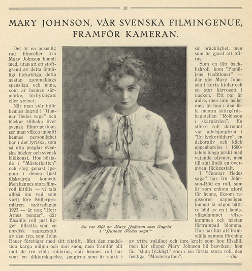 Mary Johnson har ansetts som svensk films vackraste skådespelerska men hon var skygg för publicitet och det finns mycket lite skrivet om henne. Vår vackra Mary avled 7 maj 1975 i Stockholm och hon ligger begravd där på Slottskyrkogården. Hon var liten, späd och blåögd och såg säkert ut som en riktig Dununge i den titelroll som hon debuterade i år 1915.